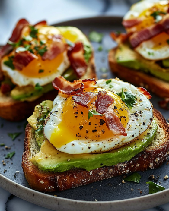 Jeder Bissen bietet eine Kombination aus Knusprigkeit, Cremigkeit und Würze. Das Brot ist goldbraun und sorgt für den perfekten Crunch. Die Avocado bringt eine samtige Weichheit, während das Ei mit seinem reichhaltigen Eigelb die Textur abrundet. Der Bacon sorgt für einen salzigen, rauchigen Kick, und der scharfe Honig fügt eine unerwartete, aber harmonische Süße hinzu.