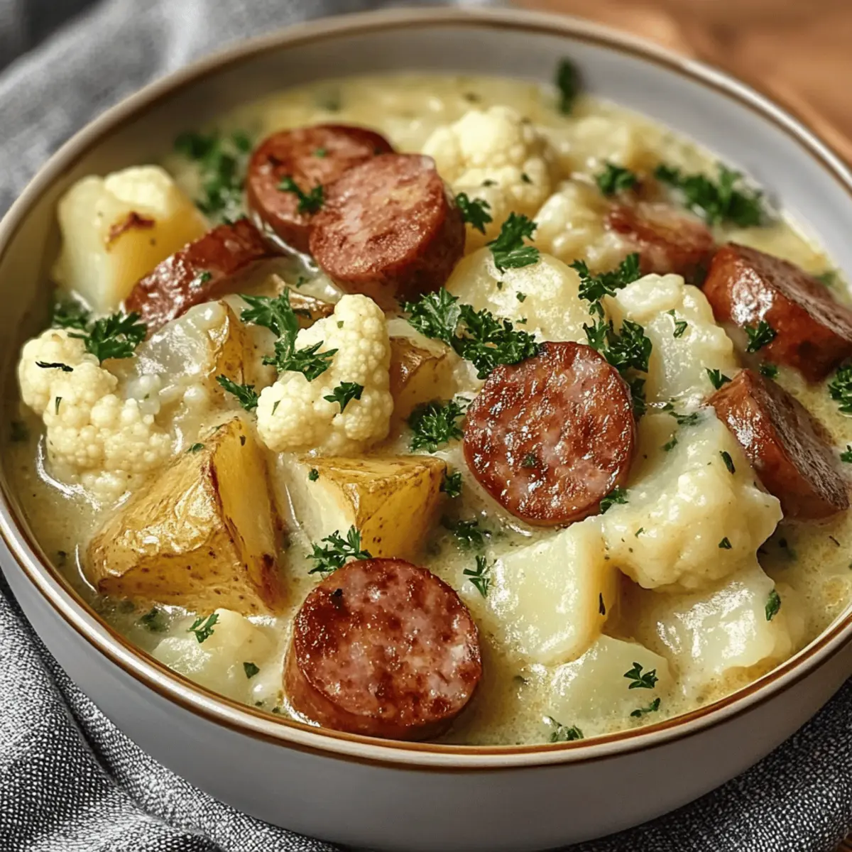 Kalte Tage verlangen nach einer herzlichen Umarmung, und was könnte da besser passen als ein wärmender Blumenkohl Kartoffel Eintopf mit Würstchen? Die Kombination aus zarten Blumenkohlröschen, sättigenden Kartoffeln und köstlichen Würstchen verwandelt jede Mahlzeit in ein gemütliches Erlebnis. Dieses Rezept ist nicht nur einfach zuzubereiten, sondern auch unglaublich vielseitig – perfekt für Familienessen oder als schnelles Abendessen nach einem langen Tag. Wenn du also etwas Herzhaftes und Nahrhaftes suchst, das auch noch Platz für kreative Variationen lässt, ist dieser Eintopf genau das Richtige für dich. Lass uns gemeinsam entdecken, wie du mit wenigen Zutaten ein Gericht zauberst, das nicht nur deinen Magen, sondern auch deine Seele wärmt! Bist du bereit, deine Küche zum Wohlfühlort zu machen?