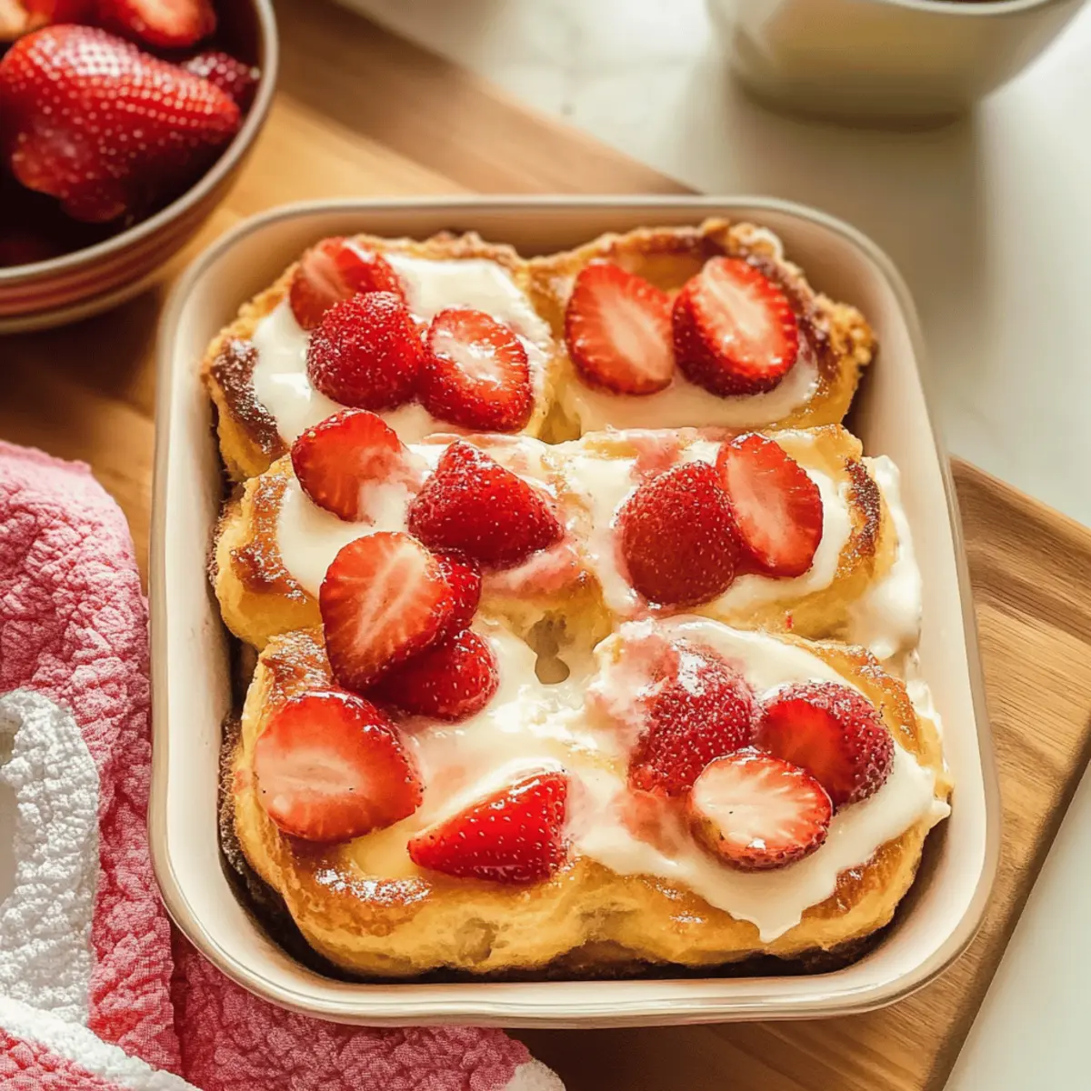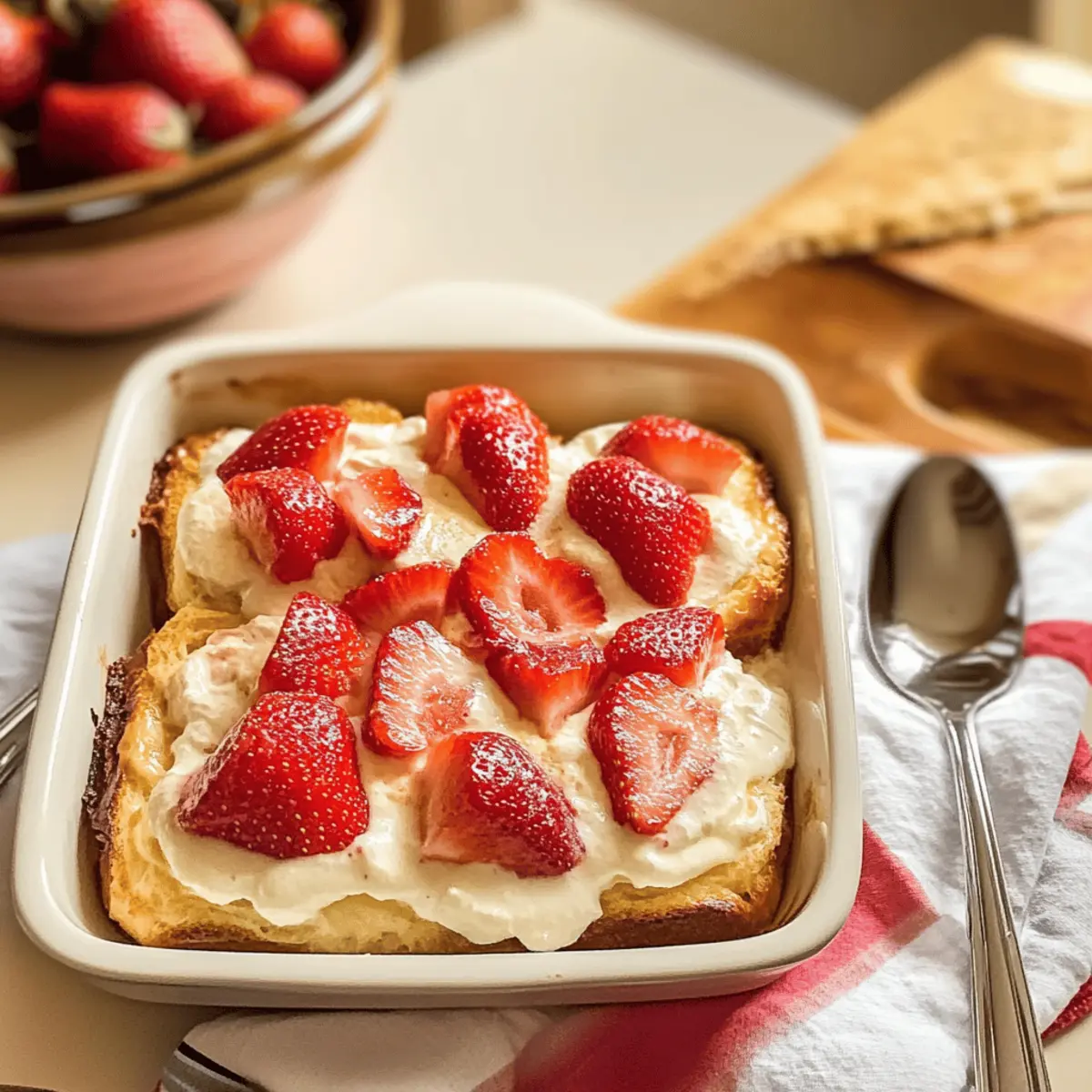 Als der Sommer näher rückte, begann ich in meiner Küche an leckeren Desserts zu experimentieren, die das Gefühl von Sonne und Frische vermitteln. Der Brioche-Auflauf mit Erdbeeren ist für mich das perfekte Ergebnis: eine köstliche Kombination aus zartem, custard-soaked Brioche und süßen, saftigen Erdbeeren – einfach unwiderstehlich! Dieses Rezept ist nicht nur mühelos zuzubereiten, sondern auch ein echter Hit bei Sommerfesten, denn es bringt alle in Urlaubsstimmung. Egal, ob als lieblicher Abschluss eines gemeinsamen Abendessens oder als süßes Frühstück am Wochenende, diese Brioche-Casserole erfüllt immer die Herzen und Mägen. Wer könnte da widerstehen? Neugierig, wie dieses Sommerdessert zum strahlenden Star auf deinem Tisch wird?
