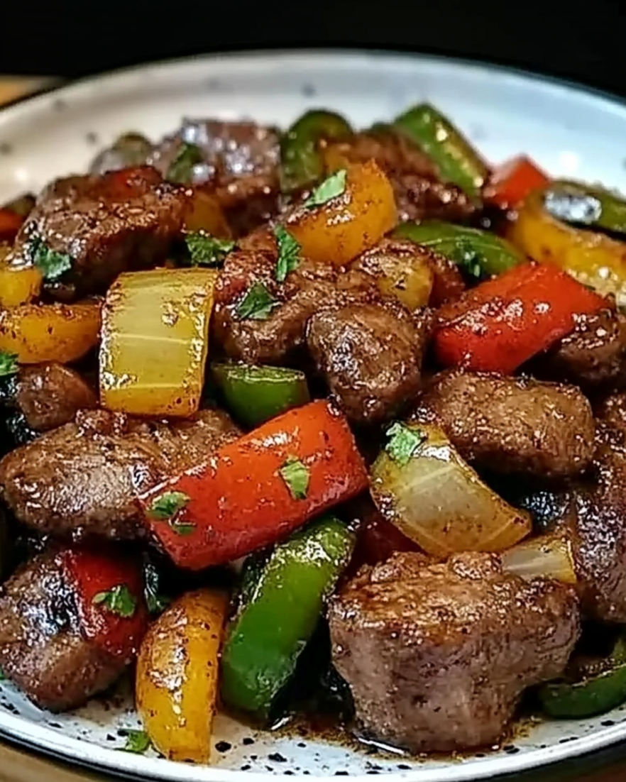 Pfeffersteak mit Paprika und Zwiebeln Rezept einfach zubereiten.