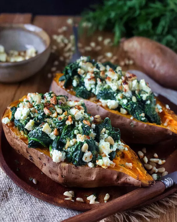 Gefüllte Süßkartoffeln mit Feta und Spinat einfach zubereiten.