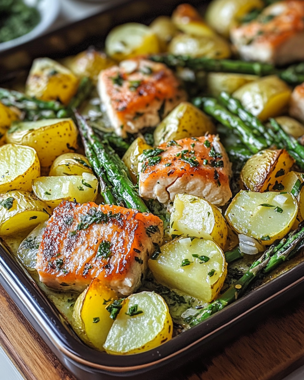 Blechlachs mit grünen Bohnen und Kartoffeln einfach zubereiten.