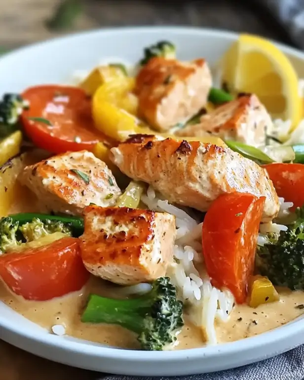 Cremige Kokos-Lachs-Gemüsepfanne einfach zubereiten!