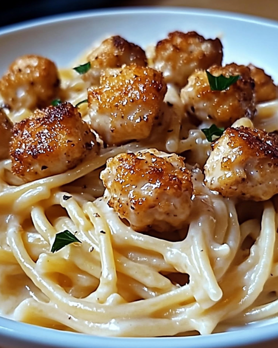 Goldene Knoblauch-Hähnchenstücke auf cremiger Parmesan-Pasta – Ein Wohlfühlessen mit Raffinesse