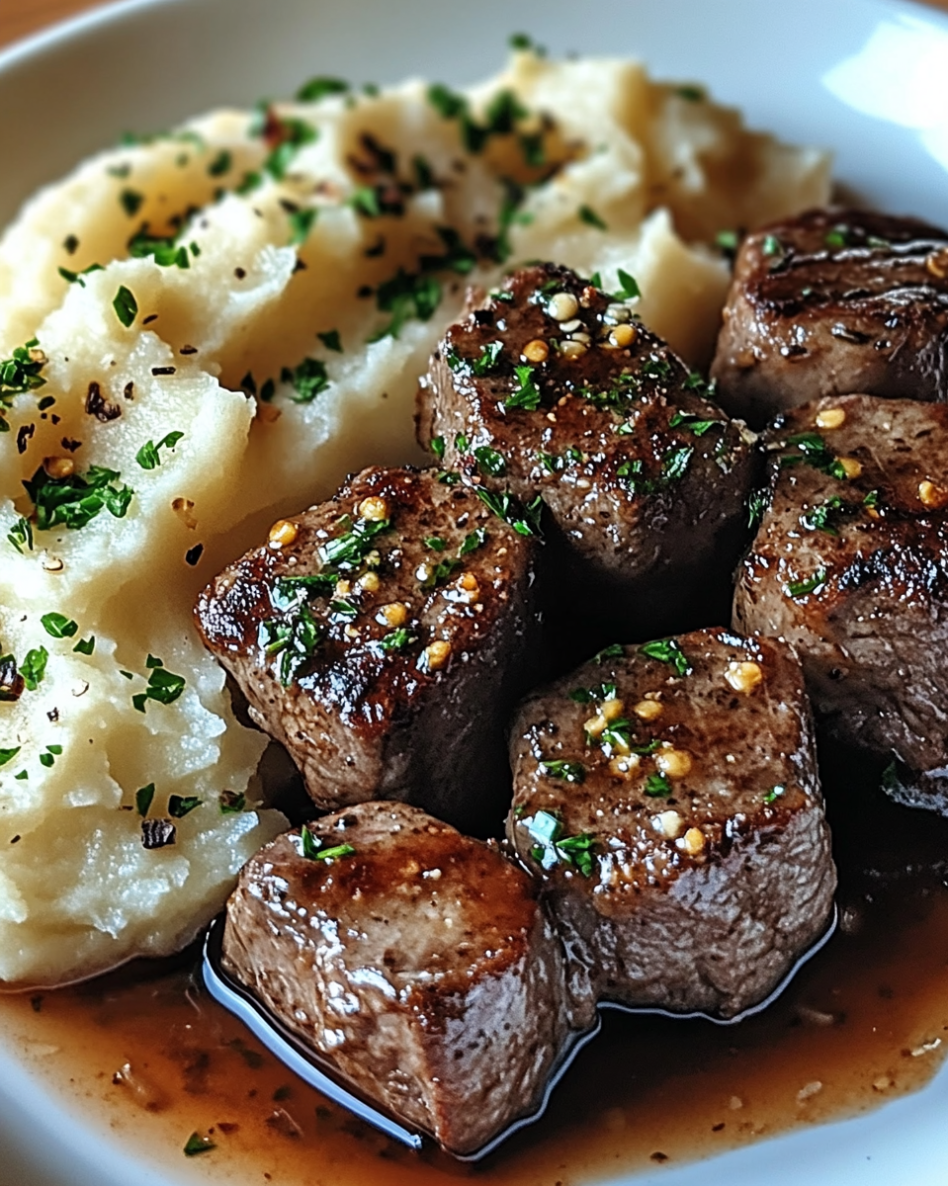 Ein Genuss für die Seele: Knoblauchbutter-Steakstücke mit Cremigem Kartoffelpüree