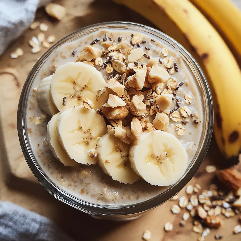 Bananen-Erdnussbutter Overnight Oats Rezept einfach zubereiten.