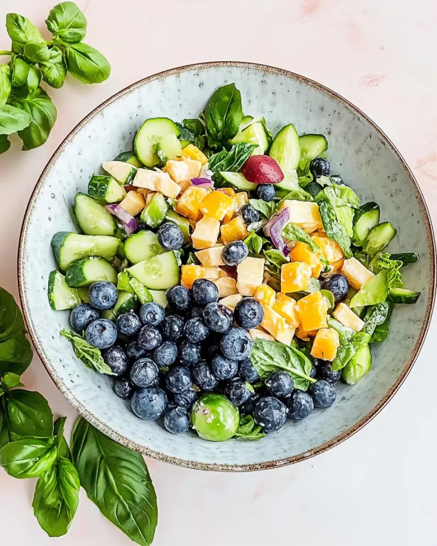 Blaubeer-Gurken-Salat mit Pfirsichen und Ziegenkäse genießen!