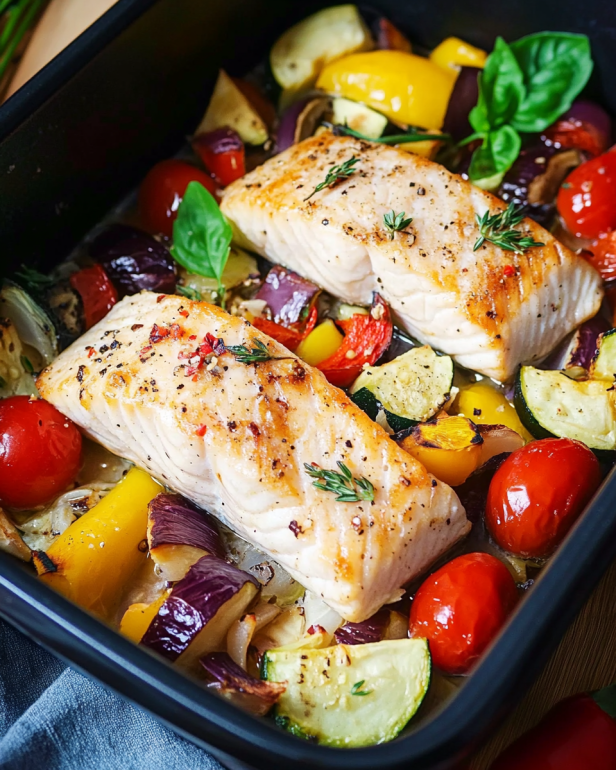 Lachs mit Gemüse aus dem Ofen ist einfach und lecker.
