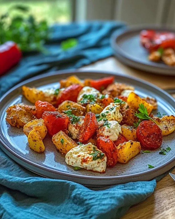 Ofengemüse mit Quark-Pesto-Hähnchen einfach zubereiten.