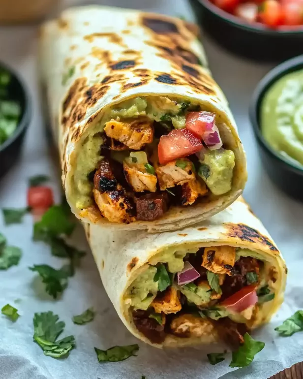 Die Basis des Burritos bildet das marinierte Hähnchen, das auf dem Grill zubereitet wird. Die Kombination aus Chipotle-Ranch-Dressing, Paprikapulver und Kreuzkümmel verleiht dem Hähnchen eine besondere Würze. Dazu kommen frische Zutaten wie Avocado, schwarze Bohnen und Mais, die für eine ausgewogene Textur und Geschmack sorgen. Der Burrito wird dann in einer großen Tortilla gewickelt, die ihn zusammenhält und einfach zu essen macht.