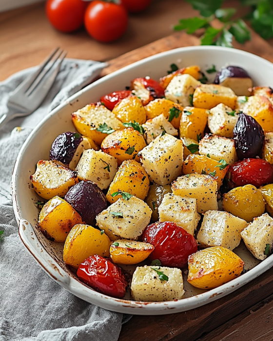 Dieses Rezept kombiniert zarte, geröstete Kartoffeln mit frischem Gemüse und herzhaftem Feta-Käse. Durch das Backen im Ofen entfalten alle Zutaten ihr volles Aroma, während der Feta für eine cremig-würzige Note sorgt. Besonders praktisch: Das Gericht benötigt kaum Vorbereitung, da der Ofen den Großteil der Arbeit übernimmt.