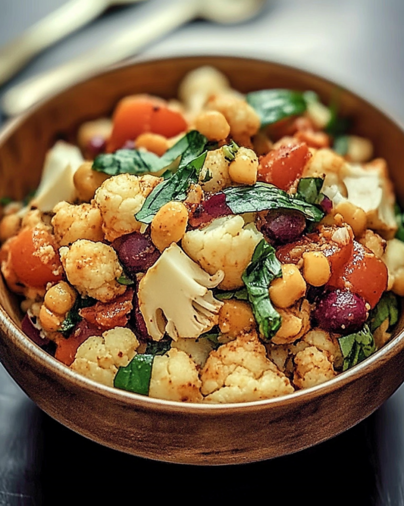 Blumenkohl ist reich an Ballaststoffen, Antioxidantien und wichtigen Vitaminen wie C und K. Kichererbsen liefern pflanzliches Eiweiß und komplexe Kohlenhydrate, die lange sättigen.