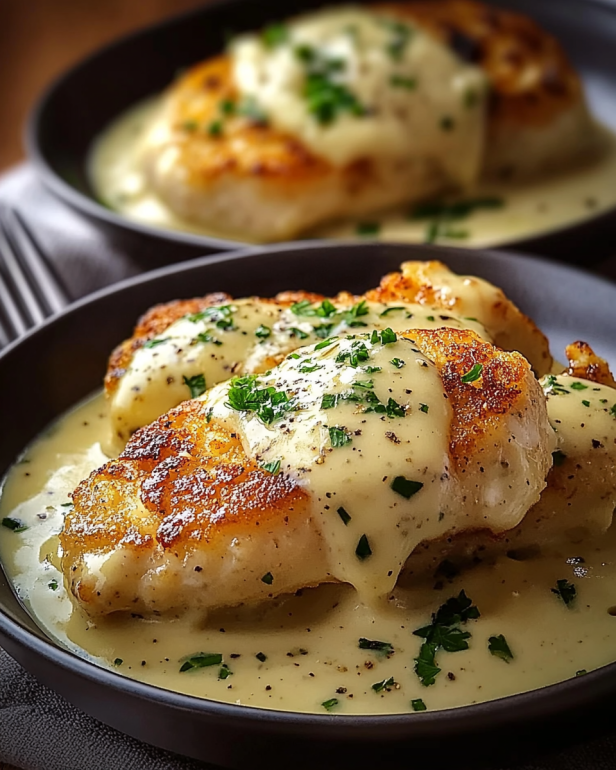 Jetzt ist Ihr Hähnchen in Knoblauch-Parmesan-Sauce bereit zum Servieren! Genießen Sie es mit frischem Baguette oder Pasta, um die köstliche Sauce aufzunehmen. Guten Appetit!