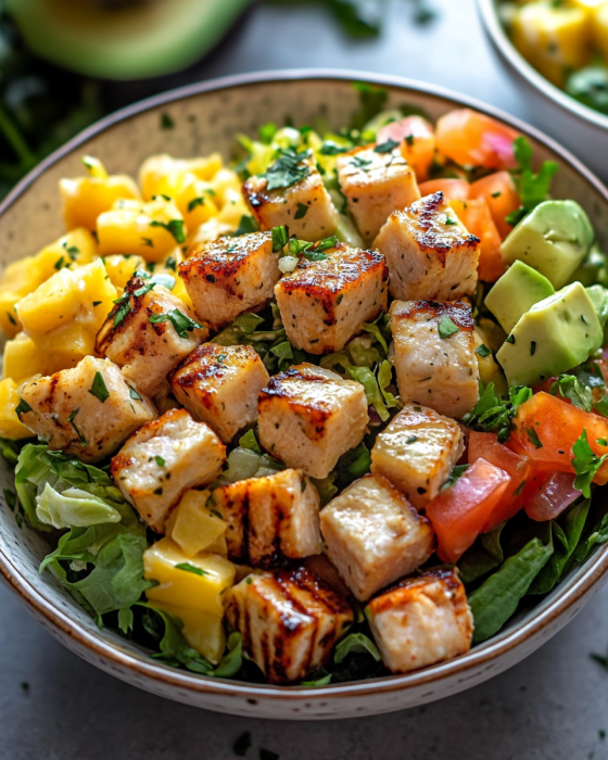 Ihr Hawaiianischer Hähnchensalat ist nun bereit zum Servieren! Genießen Sie ihn auf einem Bett aus frischem Blattsalat und garnieren Sie ihn nach Belieben mit frischer Petersilie oder Koriander. Guten Appetit! 🌺