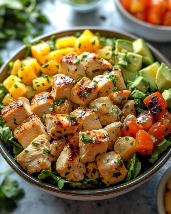 Die Kombination aus herzhaft gegrilltem Hähnchen, süßer Ananas und knackigem Gemüse macht diesen Salat zu einem echten Erlebnis. Die cremige Avocado verleiht ihm eine samtige Textur, während das frische Limetten-Dressing für eine angenehme Säure sorgt.