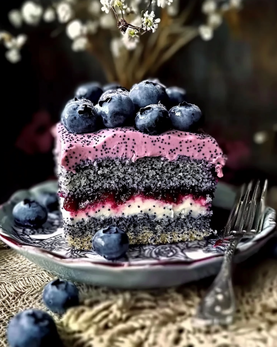 Dieser Kuchen vereint das Beste aus mehreren Welten: eine saftige Mohnbasis, eine luftige Heidelbeercreme und ein fruchtiges Topping. Die verschiedenen Schichten sorgen für ein harmonisches Geschmackserlebnis – süß, leicht säuerlich, nussig und cremig zugleich.