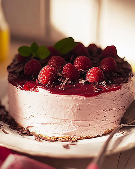 Die Himbeer-Schokotorte ist eine exquisite Kombination aus fruchtiger Frische und reichhaltiger Schokolade. Mit ihrem Schokoladenbiskuitboden, der zarten Himbeercreme und einer Dekoration aus frischen Himbeeren und Schokospänen ist sie das perfekte Dessert für Geburtstagsfeiern, Festessen oder einfach als Genuss für zwischendurch.