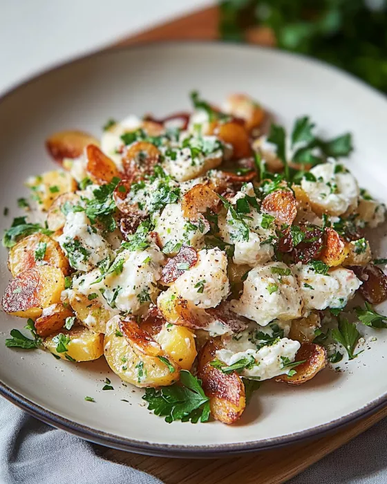 Jetzt ist Ihr krosser Kartoffelsalat fast fertig! Garnieren Sie ihn mit frischen Frühlingszwiebeln und Kräutern. Servieren Sie den Salat warm oder bei Zimmertemperatur. Genießen Sie diesen köstlichen Salat zu jeder Gelegenheit!
