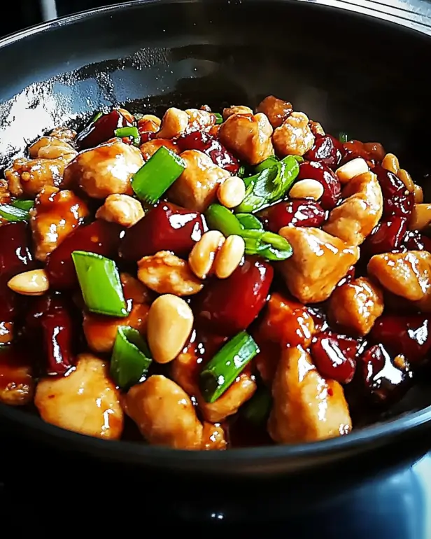Bevor Sie das Kung Pao Huhn servieren, heben Sie die gerösteten Erdnüsse und die geschnittenen Frühlingszwiebeln unter. Diese Zutaten bringen zusätzlichen Crunch und Frische ins Gericht. Servieren Sie das Kung Pao Huhn heiß, idealerweise mit einer Beilage aus Reis oder Nudeln. Genießen Sie Ihr selbstgemachtes, würziges Gericht!