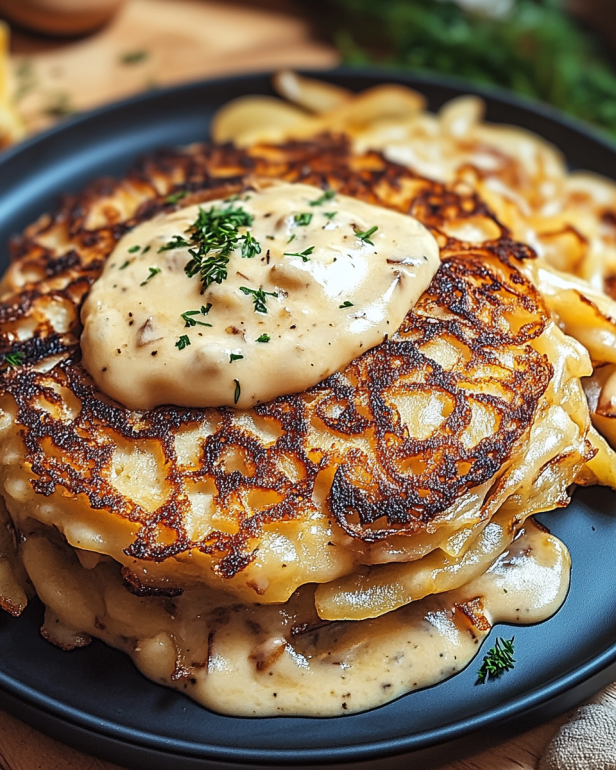 Variationen der Mozzarella-Rösti mit Zwiebel-Pilzsoße