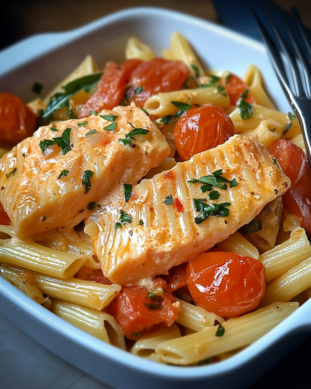 Ofen-Lachs-Pasta mit Tomaten eintauchen und entdecken, wie einfach es ist, ein köstliches und gesundes Gericht zuzubereiten!