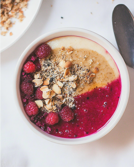 Dank der pflanzlichen Milch ist dieses Rezept besonders leicht verdaulich und eignet sich auch für Menschen mit Laktoseintoleranz. Himbeeren liefern wichtige Antioxidantien und Vitamine, während Grieß für eine langanhaltende Sättigung sorgt.
